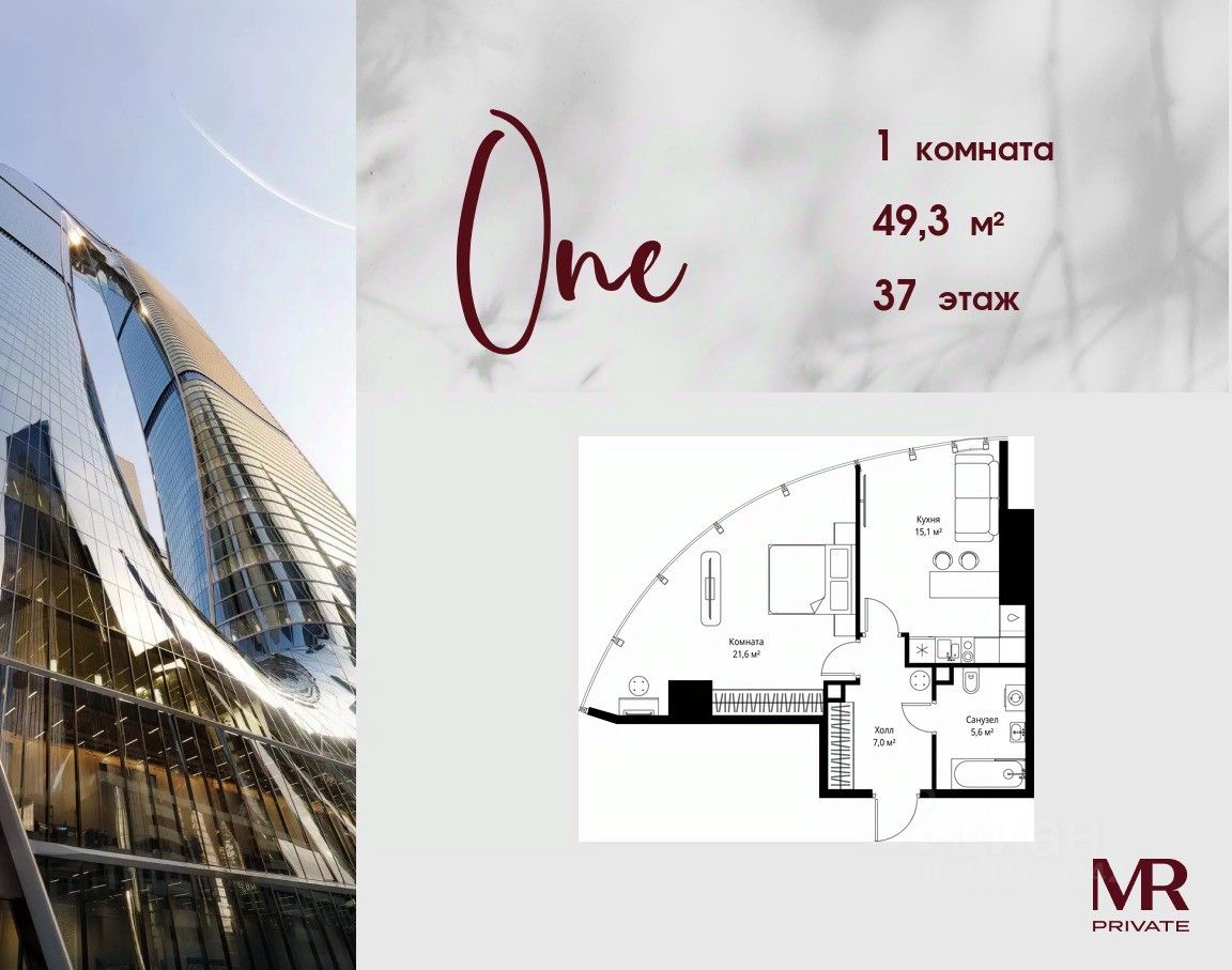 В продаже 1-комнатная квартира площадью 49.30 м² на 37-м этаже.