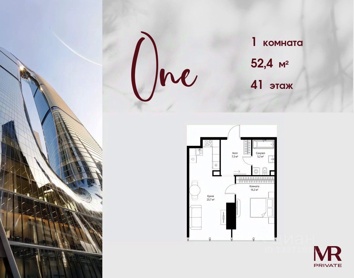 В продаже 1-комнатная квартира площадью 52.40 м² на 41-м этаже.