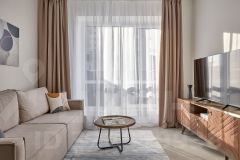 В квартире функциональная планировка: уютная изолированная спальня с вместительным шкафом и рабочим местом, просторная гостиная с дополнительным спальным местом и тв-зоной, а также полностью укомплектованная техникой кухня и дизайнерский санузел с полноценной ванной. Из гостиной выход на светлый балкон с зоной отдыха.