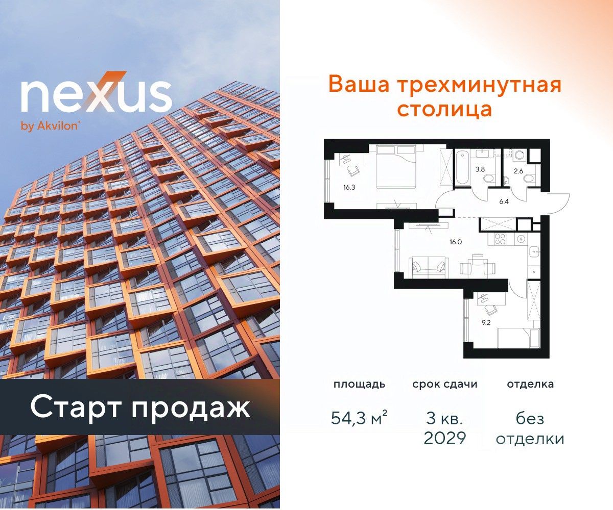 Продажа от застройщика. О проекте: В основе NEXUS by Akvilon лежит принцип трехминутного города, где вся жизнь: работа, отдых, здоровье, общение и культура сосредоточены в шаговой доступности. Он не просто экономит время, а кардинально перераспределяет его. В этих условиях главным логистическим узлом становится лифт, который в считанные секунды переносит из квартиры в собственный фитнес-рум, панорамный двор или современный коворкинг. Здесь вы сами решаете: оказаться в эпицентре событий, чувствуя пульс мегаполиса, или наслаждаться тишиной и приватностью своего пространства. И главное — вы можете переключаться, находя идеальный баланс каждый день. NEXUS by Akvilon - ваша трехминутная столица! Транспортная доступность NEXUS дарит независимость от расстояний и логистики. Ваше время теперь принадлежит только вам меньше минуты до метро Молодежная 2 минуты до Рублевского шоссе 10 минут до Проспекта Багратиона 15 минут до Москва-Сити 10 минут до МКАД 20 минут до ТТК Архитектура 46-этажная башня станет новой архитектурной доминантой, символизирующей динамику и технологичность современной жизни.Комбинация алюминиевых кассет, стеклофибробетона и витражного остекления фасада создает монументальную оболочку, а теплая цветовая гамма добавляет масштабной форме визуальной теплоты. Три разных по характеру стороны башни — от строгой "зубчатой" геометрии до живописных эркеров — создают многогранный, ритмичный образ, дополняемый невесомыми балконами со стеклянным ограждением. Архитектура проекта живет в диалоге с городом: променад вдоль парящего стилобата со стрит-ретейлом становится естественным продолжением общественного пространства. Планировки в концепции Разумные метры Мы создали квартиры, где пространство работает на ваш комфорт. В основе концепции "Разумные метры" правильная геометрия помещений и тщательно продуманные эргономичные решения. - Высота потолков до 3,55 метров - Многообразие планировок: от студий до четырехкомнатных квартир классического и евро-формата - Многофункциональные пространства: кухни-гостиные для приема гостей и зонированные мастер-спальни - Продуманная инфраструктура быта: отдельные постирочные и гостевые санузлы - Удобные системы хранения: встроенные ниши и гардеробные зоны - Уникальные форматы: пентхаусы, комнаты с двумя окнами, угловое панорамное остекление - Возможность открытия окон на всех высотах Для студий и однокомнатных квартир мы предлагаем готовое решение — отделку White box, позволяющую сразу приступить к чистовому ремонту на ваш вкус. Для остальных планировок предусмотрена черновая отделка, чтобы воплотить все интерьерные пожелания. Здесь пространство адаптируется под ваш образ жизни, а не вы подстраиваетесь под планировку. Приватное благоустройство Скрытый на виду панорамный двор-терраса, расположенный на высоте 7 метров, объединил внутреннюю камерность и внешнюю динамику городской жизни. - Многоуровневое озеленение с всесезонными композициями, сохраняющими декоративно