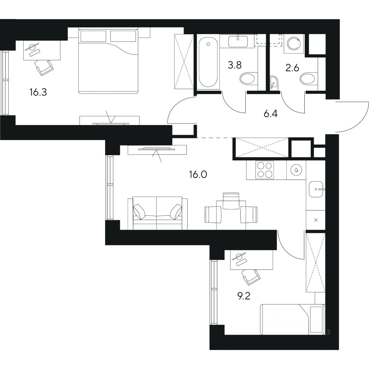 Общая площадь54,3 м²