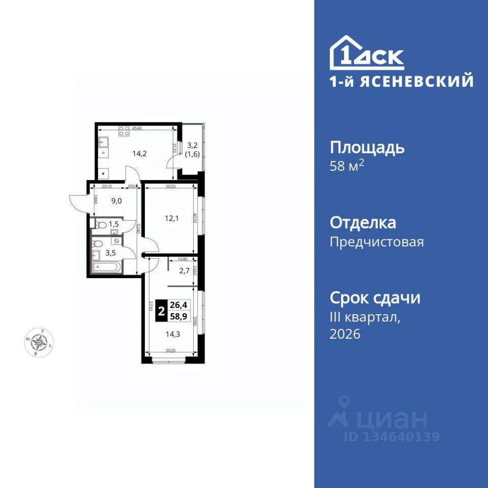 Продаётся 2-к квартира номер 419 общей площадью 58.9 кв.м. на 2-м этаже 18 этажного здания. Отделка Whitebox. Цена с учётом скидки.