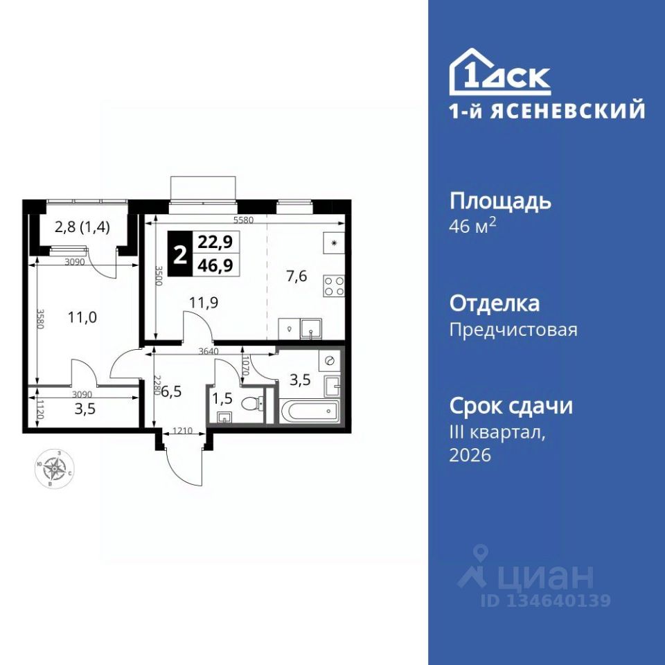 Продаётся 2-к квартира номер 560 общей площадью 46.9 кв.м. на 14-м этаже 18 этажного здания. Отделка Whitebox. Цена с учётом скидки.