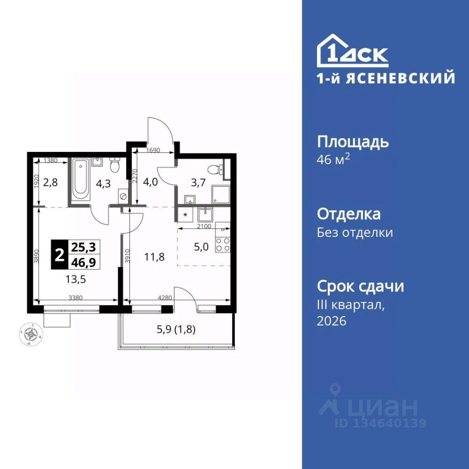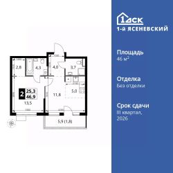 Продаётся 2-к квартира номер 503 общей площадью 46.9 кв.м. на 9-м этаже 9 этажного здания. Без отделки.