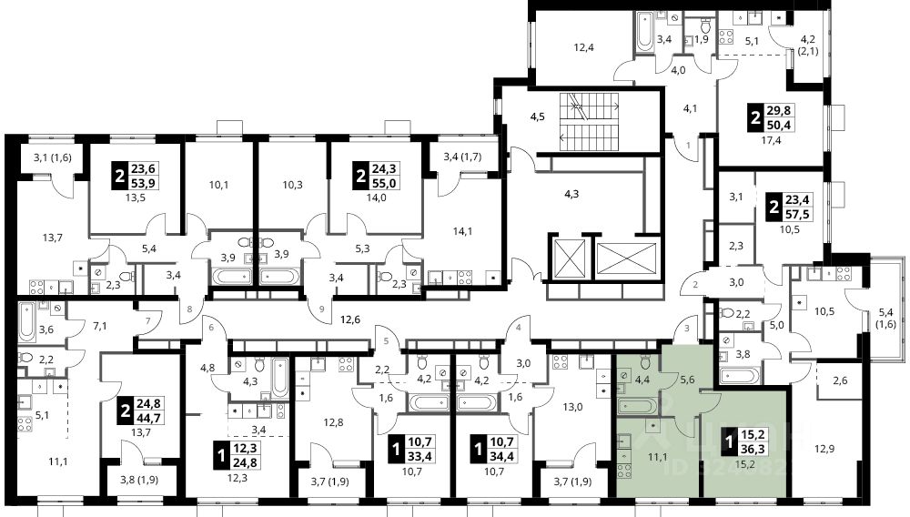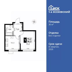 Продаётся 1-к квартира номер 596 общей площадью 36.3 кв.м. на 3-м этаже 18 этажного здания. Без отделки.