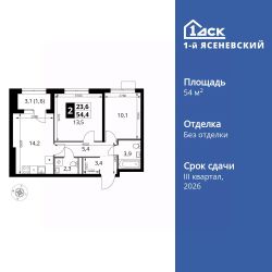 Продаётся 2-к квартира номер 736 общей площадью 54.4 кв.м. на 18-м этаже 18 этажного здания. Без отделки.