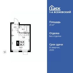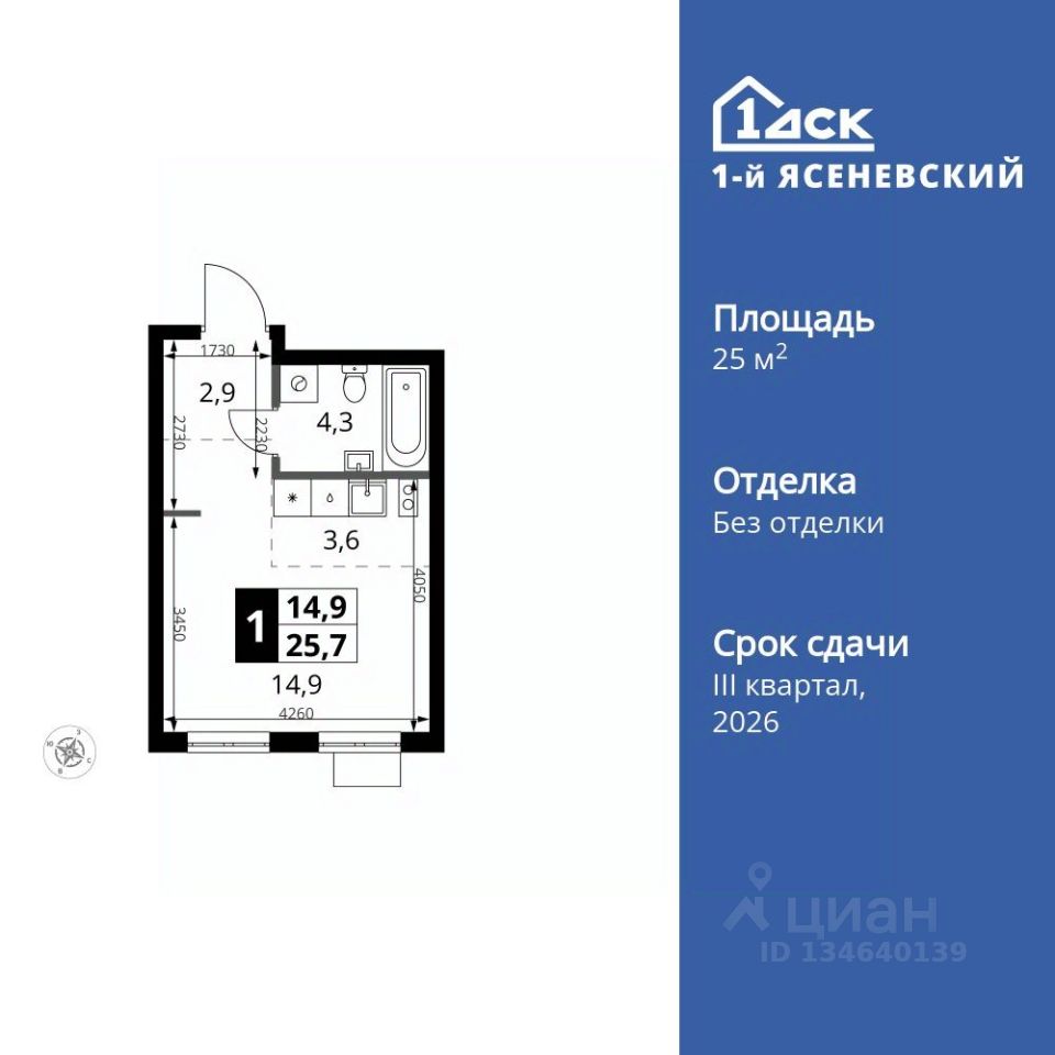 Продаётся квартира-студия номер 729 общей площадью 25.7 кв.м. на 14-м этаже 16 этажного здания. Без отделки.