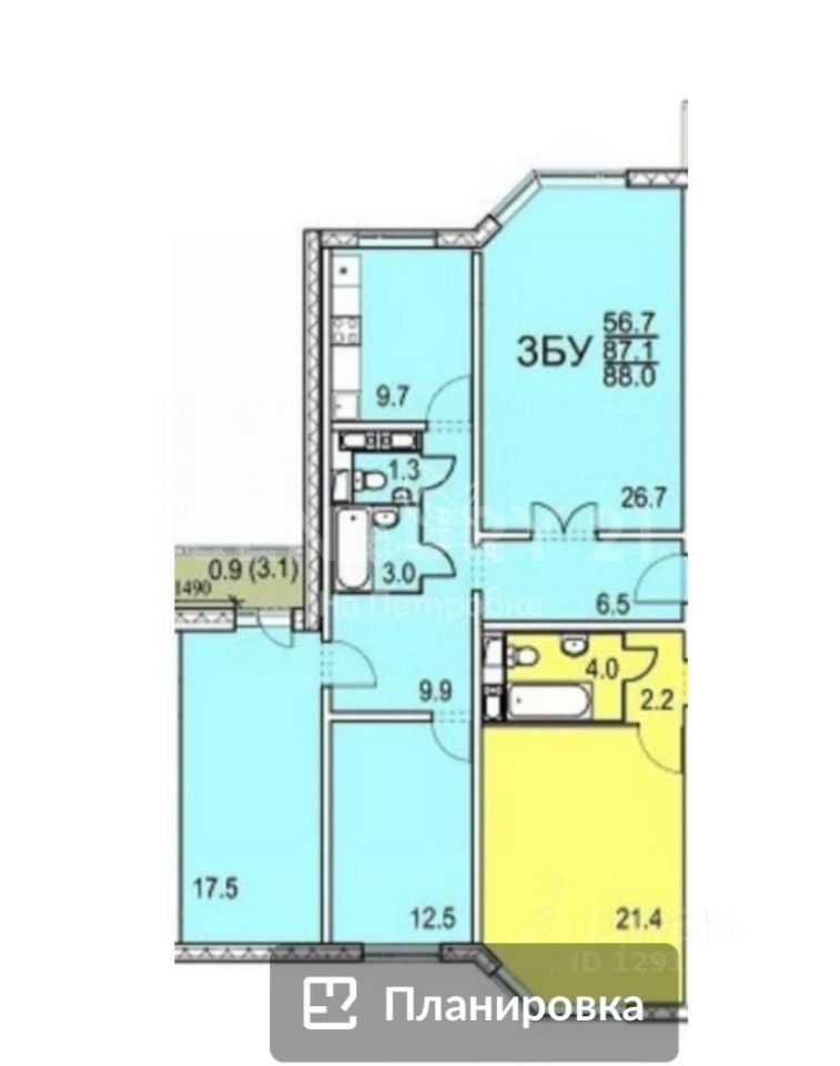 Планировка: Уникальная планировка с двумя изолированными спальнями (12.5 м² и 17.5 м²), большой гостиной (27 м²) и проходной комнатой (10 м²), которую можно использовать как гардеробную или кабинет.