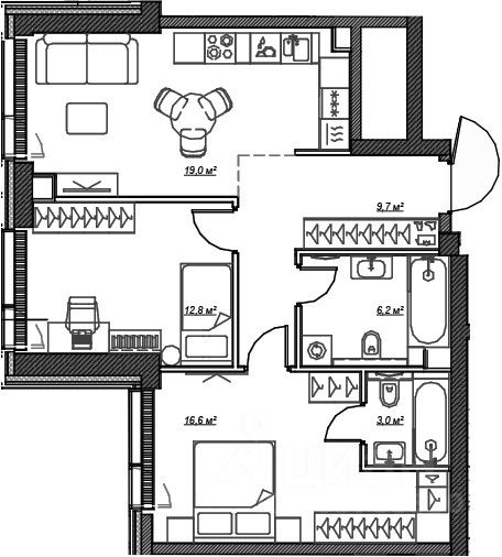 Отличное предложение в ЖК VEER от MR Group! Функциональная планировка: просторная кухня-гостиная и две изолированные комнаты.