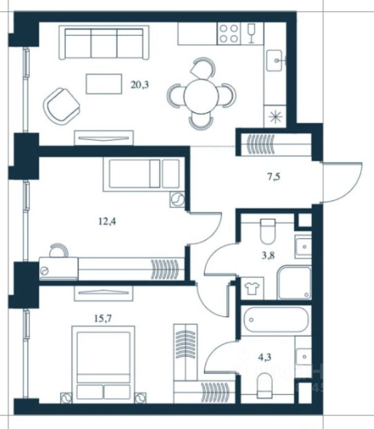 Планировка: кухня-гостиная, 2 спальни, 2 санузла, гардеробная, холл, постирочная.