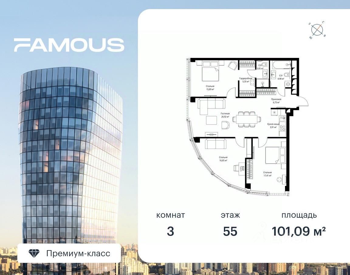 Продаётся 3-комнатная квартира площадью 101.09 м² с предчистовой отделкой на 55-м этаже премиального небоскреба Famous.