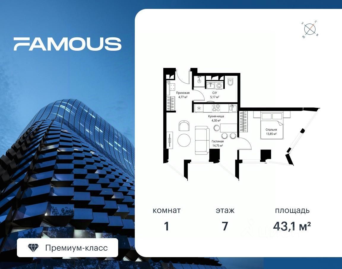 Продаётся 1-комнатная квартира общей площадью 43.10 м² с предчистовой отделкой на 7-м этаже премиального небоскреба Famous.
