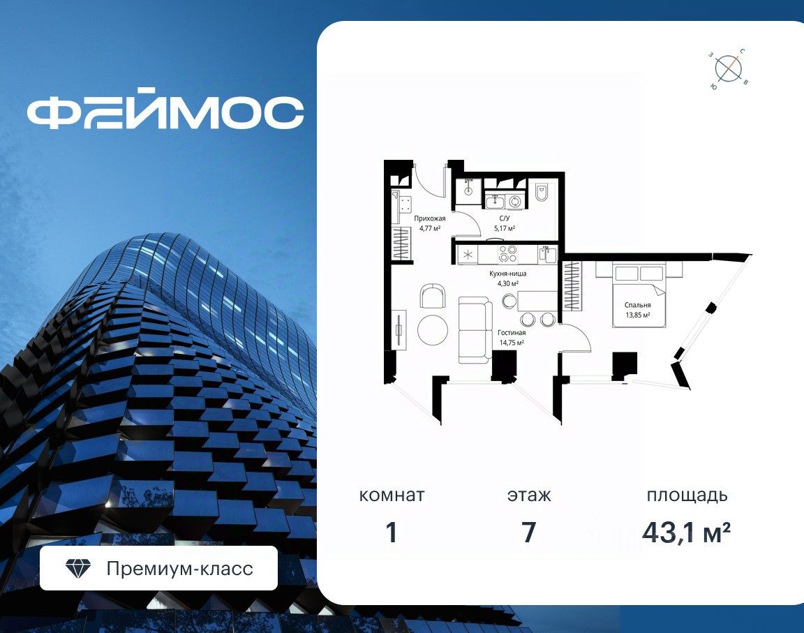 Продаётся 1-комнатная квартира общей площадью 43.10 м² с предчистовой отделкой на 7-м этаже премиального небоскреба Феймос.