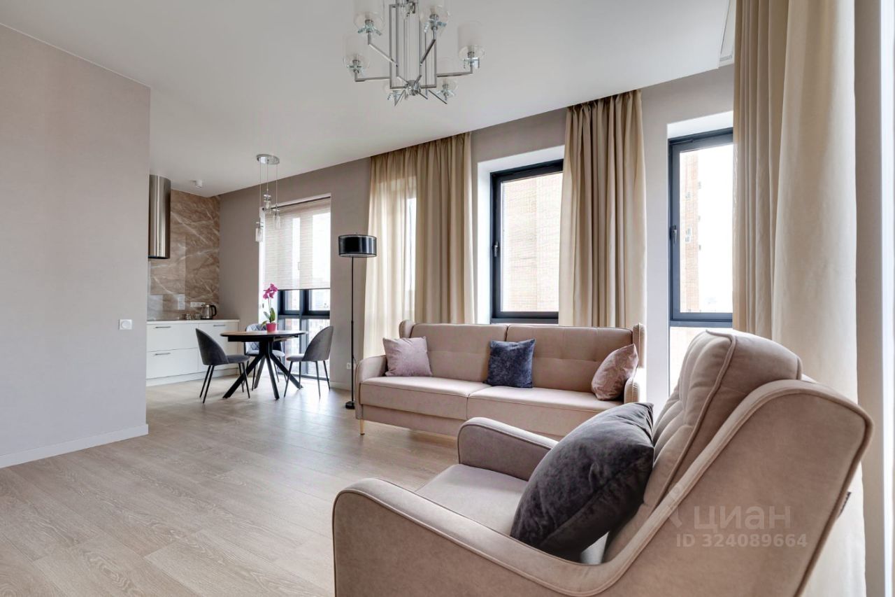 Планировка квартиры: просторная кухня-гостиная; мастер-спальня со своим санузлом с ванной и выходом на застекленную лоджию (+3 метра к общей площади квартиры); гостевая спальня/детская комната; второй санузел с душевой кабиной; гардеробная.
