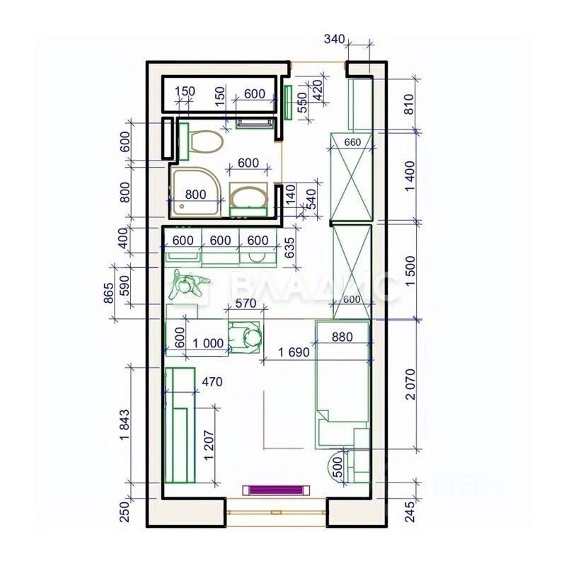 Общая площадь студии составляет 19 кв. м, из которых 10 кв. м — жилая площадь, а 5 кв. м — кухня. Наличие совмещённого санузла делает планировку удобной и практичной.