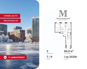 Продаётся 3-к квартира 84,9 кв.м. в ЖК "Михалковский" на 7-м этаже 9 этажного дома.