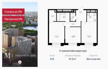 Продаётся 3-к квартира 61,5 кв.м. в ЖК "Михалковский" на 9-м этаже 9 этажного дома.
