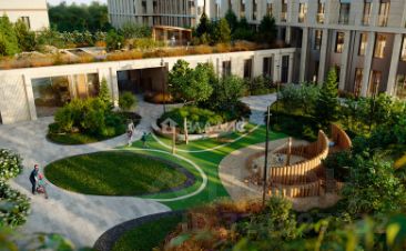 Территория проекта разделена на несколько функциональных зон. Во дворе выполнен ландшафтный дизайн, предусмотрены детские и спортивные площадки, а также зоны отдыха. В проекте предусмотрены два детских сада на 100 и 200 мест, один из которых с игровой и прогулочной зоной на крыше.