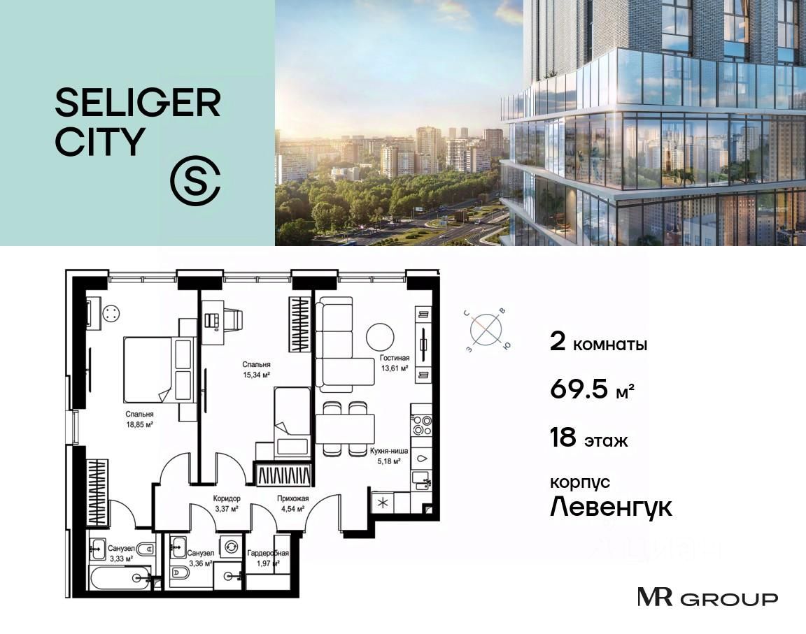 Продаётся 2-комнатная квартира общей площадью 69.55 м² без отделки в ЖК "Селигер Сити" на 18-м этаже 21 этажного дома.