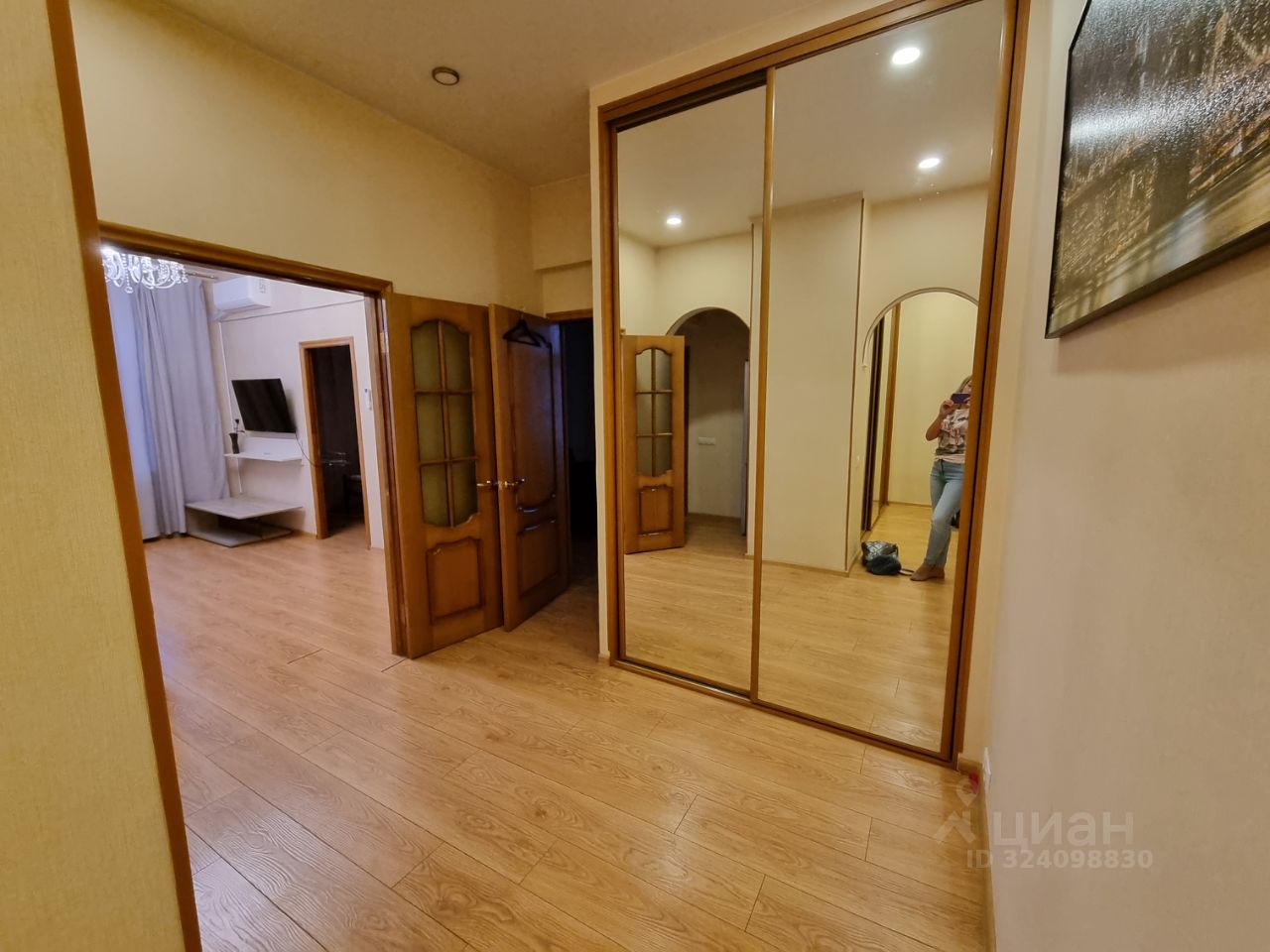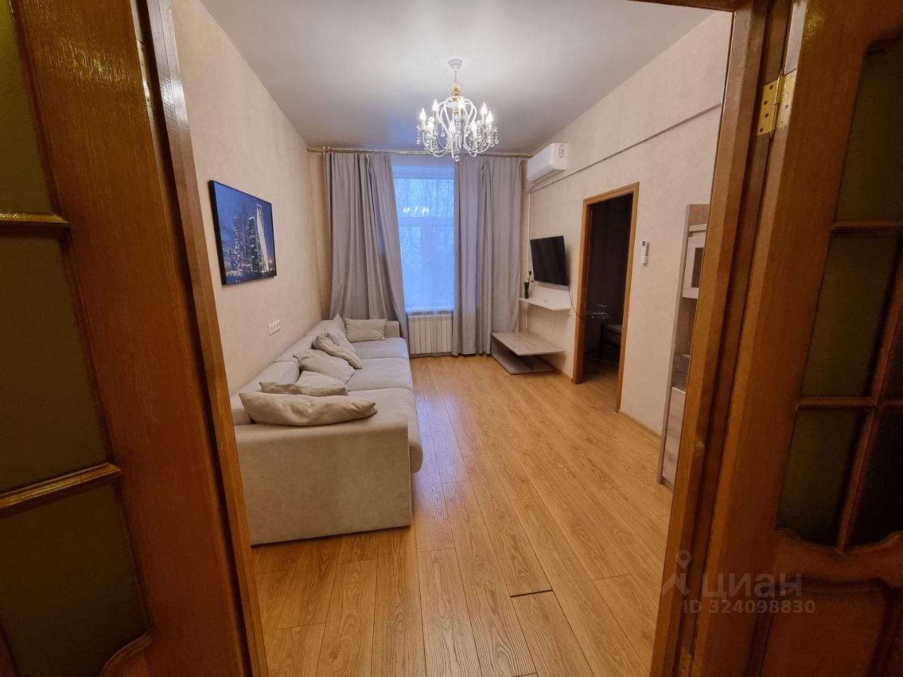 • Бытовая техника: кондиционеры (установлены в гостиной и кухне), настенный телевизор. Состояние техники хорошее, всё функционирует.