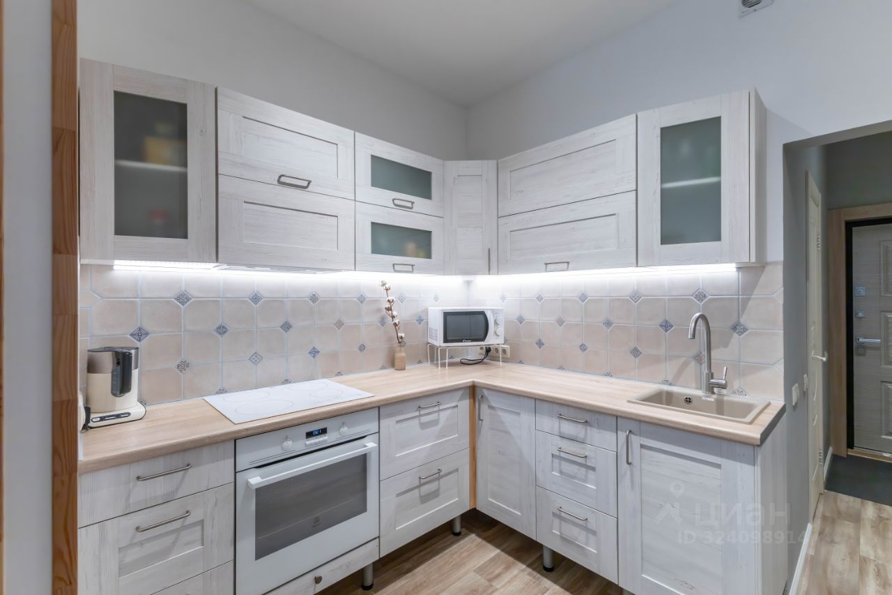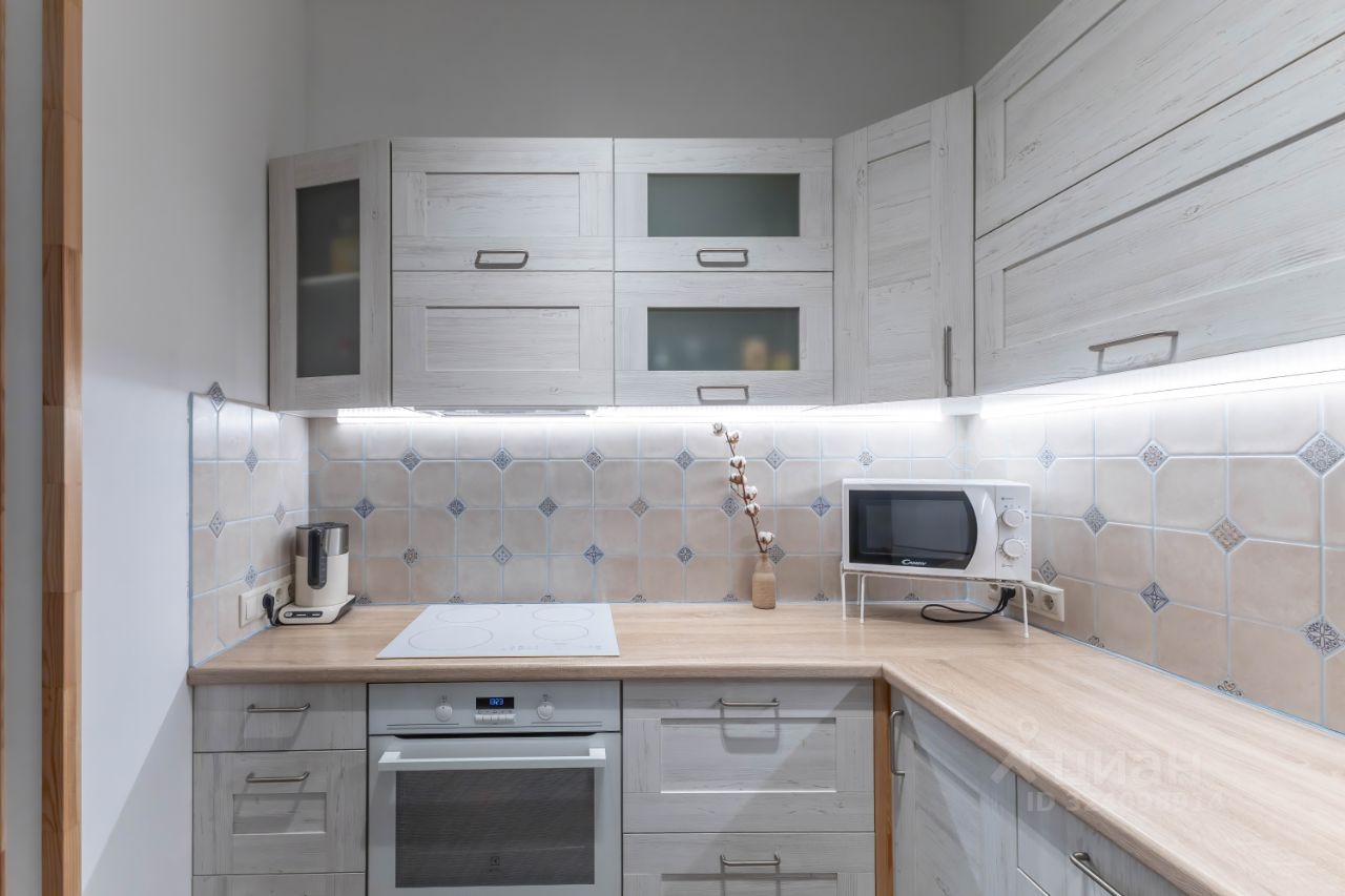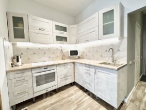 Кухонный гарнитур со встроенной бытовой техникой, холодильник, вместительные шкафы - всё в одном стиле.