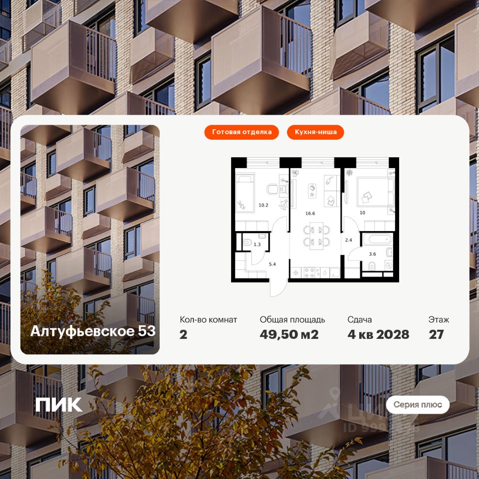 Продаётся 2-комн. квартира площадью 49,5 кв.м на 27 этаже 32 этажного дома (Корпус 1.1, Секция 4) проекта ПИК Алтуфьевское 53. Светлый просторный подъезд на уровне земли, функциональная планировка, большие окна, c отделкой.