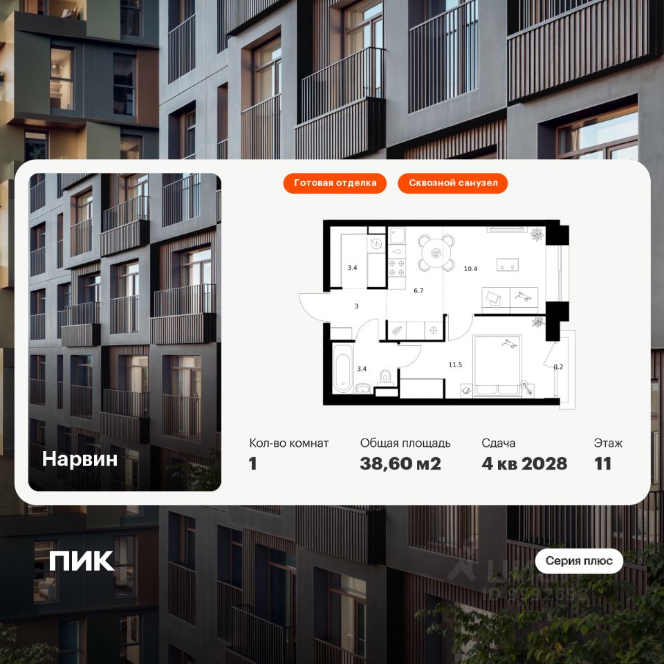 Новостройка! Продается 1-комн. кв-ра площадью 38,6 кв.м, (Корпус 1.2, Секция 2) 11 этаж 19-этажного дома в Нарвин от ПИК. Новый проект ПИК Серии плюс "Нарвин" возводится в Головинском районе Москвы.