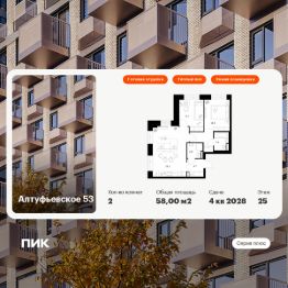 Продаётся 2-комн. квартира площадью 58 кв.м на 25 этаже 32 этажного дома (Корпус 1.1, Секция 4) проекта ПИК Алтуфьевское 53. Светлый просторный подъезд на уровне земли, функциональная планировка, большие окна, c отделкой.
