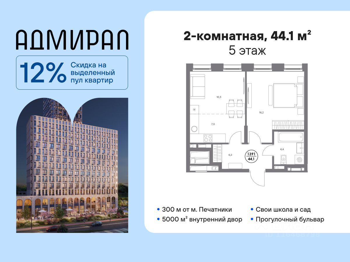 В динамично развивающемся районе Москвы, всего в 300 метрах от метро и в пешей близости от нового городского порта с протяженной набережной 13 км, свободной от автомобилей, продается 2-комнатная квартира площадью 44.10 м². без отделки. Квартира находится в корпусе жилого комплекса бизнес-класса "Адмирал", расположенного по адресу г. Москва, ул. Шоссейная, 4Д. (Застройщик - "Галс Девелопмент"). Новый амбициозный проект "Адмирал" станет частью одного из самых перспективных районов будущего - "Сити-2". В пешей доступности от современных башен Вас ждут живописные Люблинские пруды, 2 усадьбы с уникальной историей и уютный парк "Печатники" у Перервинского плёса. Район имеет отличную транспортную доступность: • 300 метров до станции метро "Печатники"; • Удобная пересадка на БКЛ и станцию МЦД-2; • 10 минут на машине до ТТК; • 15 минут до Садового кольца. Архитектура корпусов отличается динамичностью облика благодаря переменной этажности: высокие башни сочетаются с домами средней этажности. Изящным украшением становятся арочные витражи. Интеллигентный и современный стиль "Адмирала" продолжается в гранд-лобби: пастельные оттенки интерьера и фактурные элементы декора создают атмосферу безмятежного отдыха, особое ощущение простора дарят высокие потолки до 4 м и витражные окна. В домах предусмотрено от трех до шести скоростных лифтов, каждый из них спускается на любой этаж подземного паркинга и обладает удобными сенсорными панелями управления и низким уровнем шума. Благоустроенный двор площадью 5000 кв.м. украсят десятки видов гипоаллергенных растений. Здесь можно совершить приятный променад, по пути заглядывая за свежезаваренным кофе, уединиться за ноутбуком в комфортном коворкинге, занять ребенка играми в двухъярусном плейхабе или помедитировать на специальной площадке для йоги. Мягкий свет декоративных фонарей подчеркнет живописность местности, а чувство безопасности гарантируют круглосуточные системы видеонаблюдения. Дополнительные преимущества: • Высокие потолки от 2,9 до 3,25 м; • Бизнес-центр, школа и детский сад прямо на территории дома; • Подземный двухуровневый паркинг на 1955 машино-мест; • Кладовые помещения в тёплом контуре на 2м этаже; • Стрит-ритейл на первых этажах.