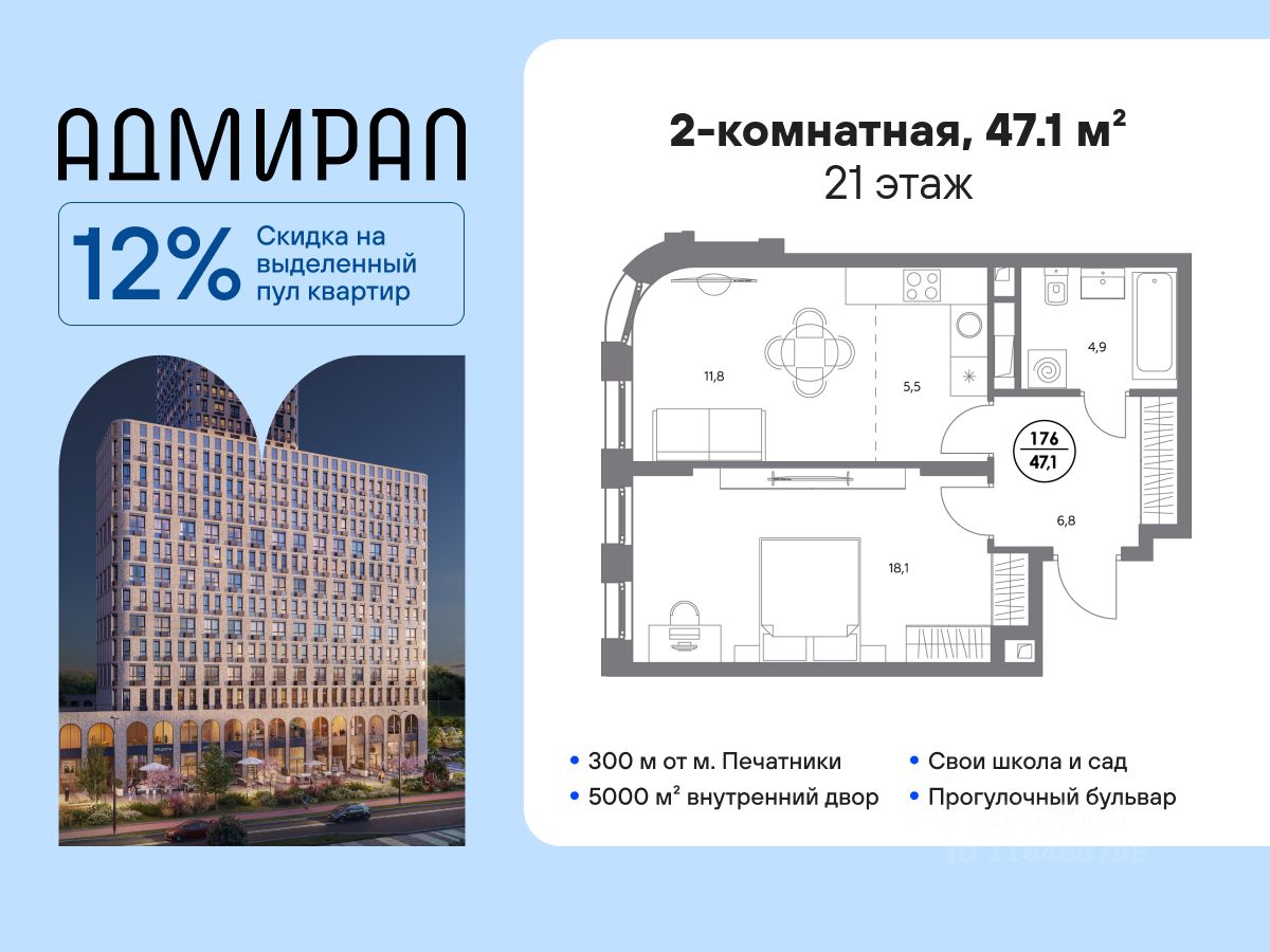 В динамично развивающемся районе Москвы, всего в 300 метрах от метро и в пешей близости от нового городского порта с протяженной набережной 13 км, свободной от автомобилей, продается 2-комнатная квартира площадью 47.10 м². без отделки.