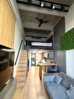 Площадь по документам 27 кв.м. + 15 м². (2 антресоли), высота потолка 4,5 м.
