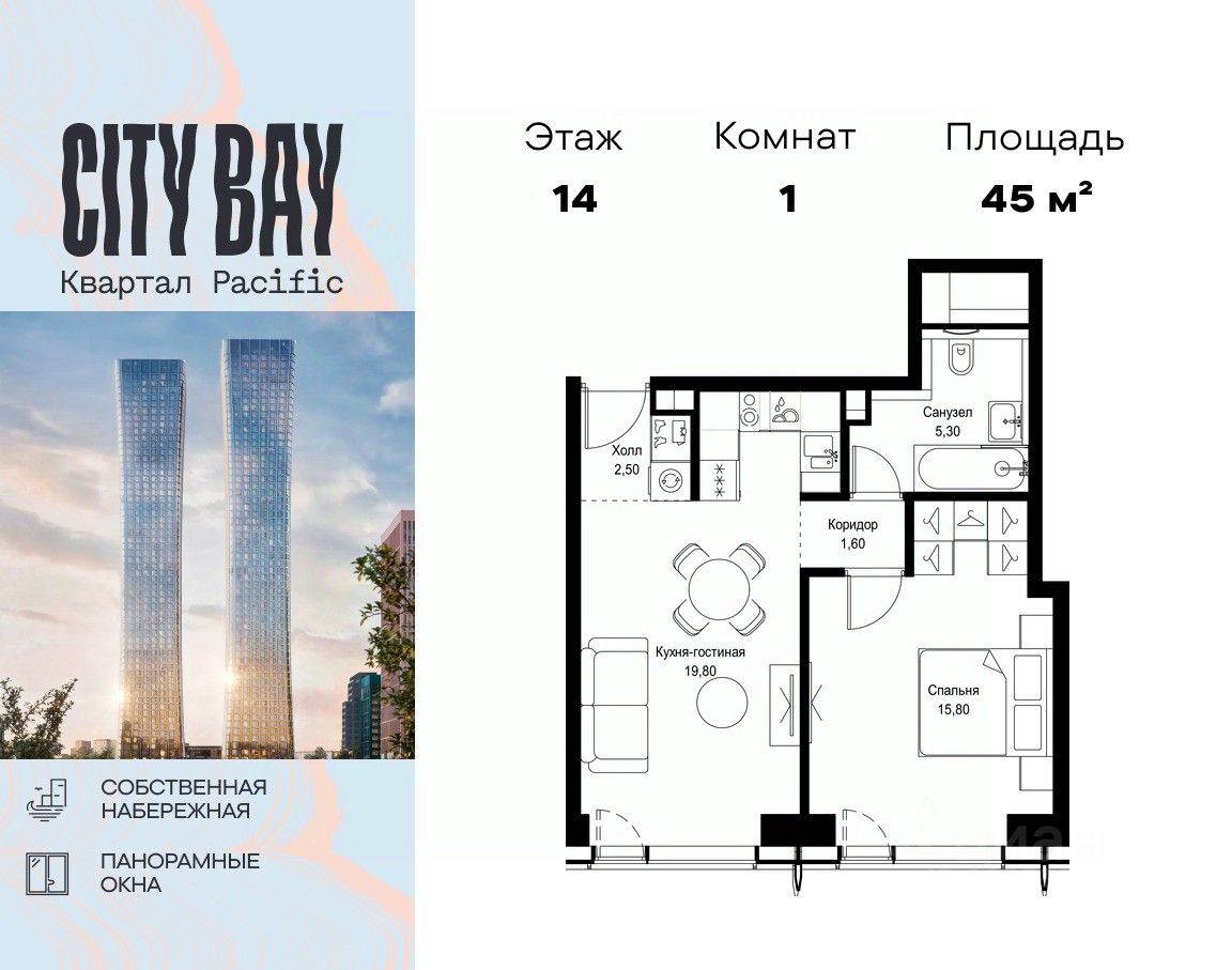 Продаётся 1-комнатная квартира общей площадью 45 м² без отделки в ЖК City Вау, квартале Pacific, на 14-м этаже 16 этажного дома.