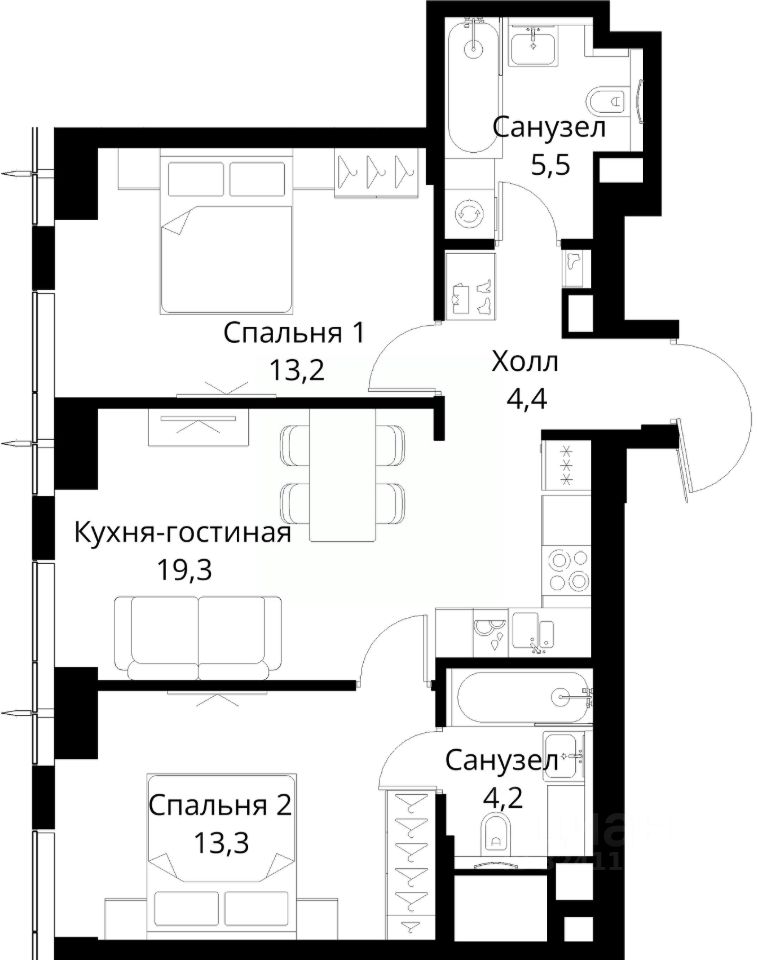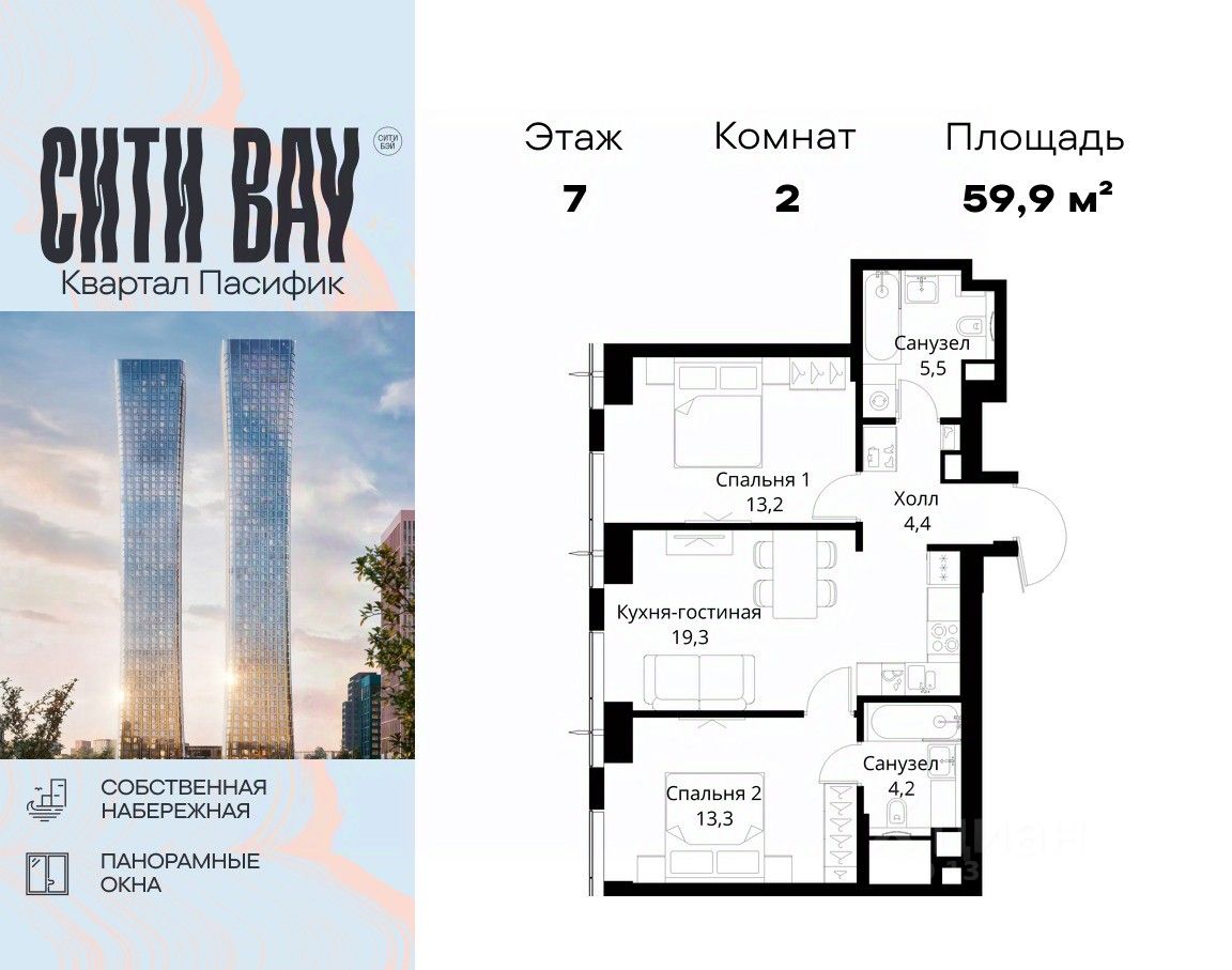 Продаётся 2-комнатная квартира общей площадью 59.90 м² без отделки в ЖК Сити Бэй, квартале Пасифик, на 7-м этаже 59 этажного дома.