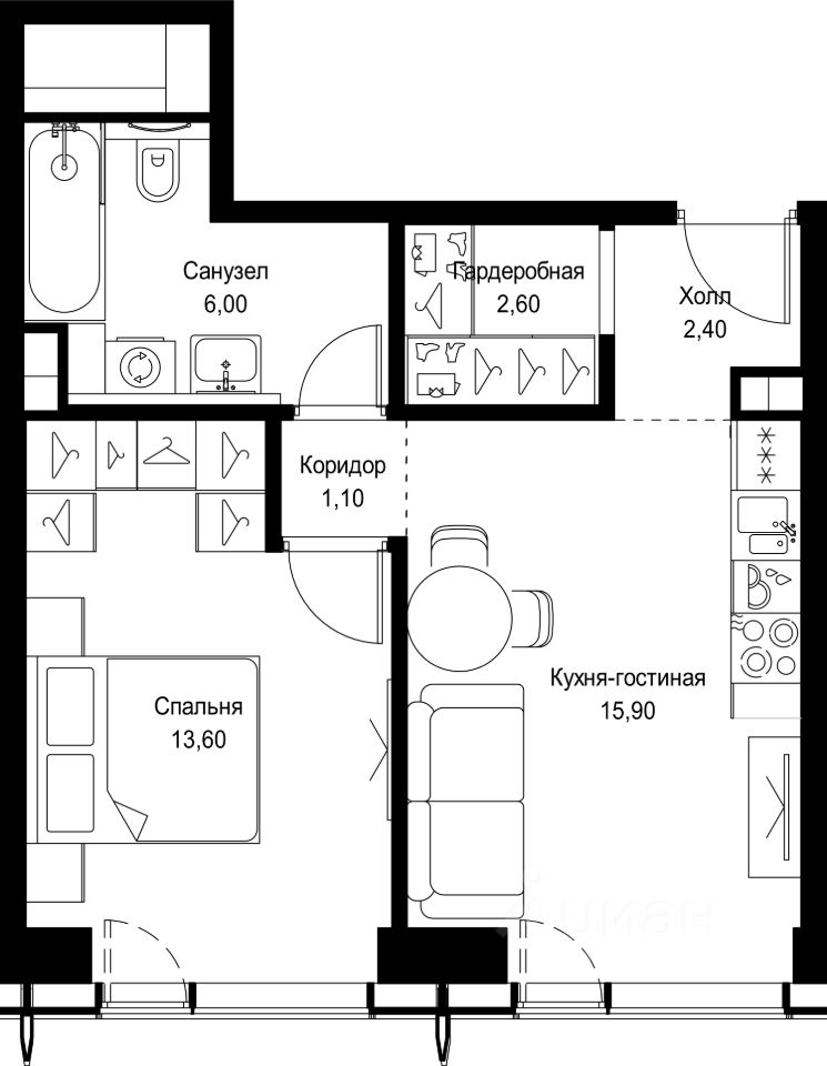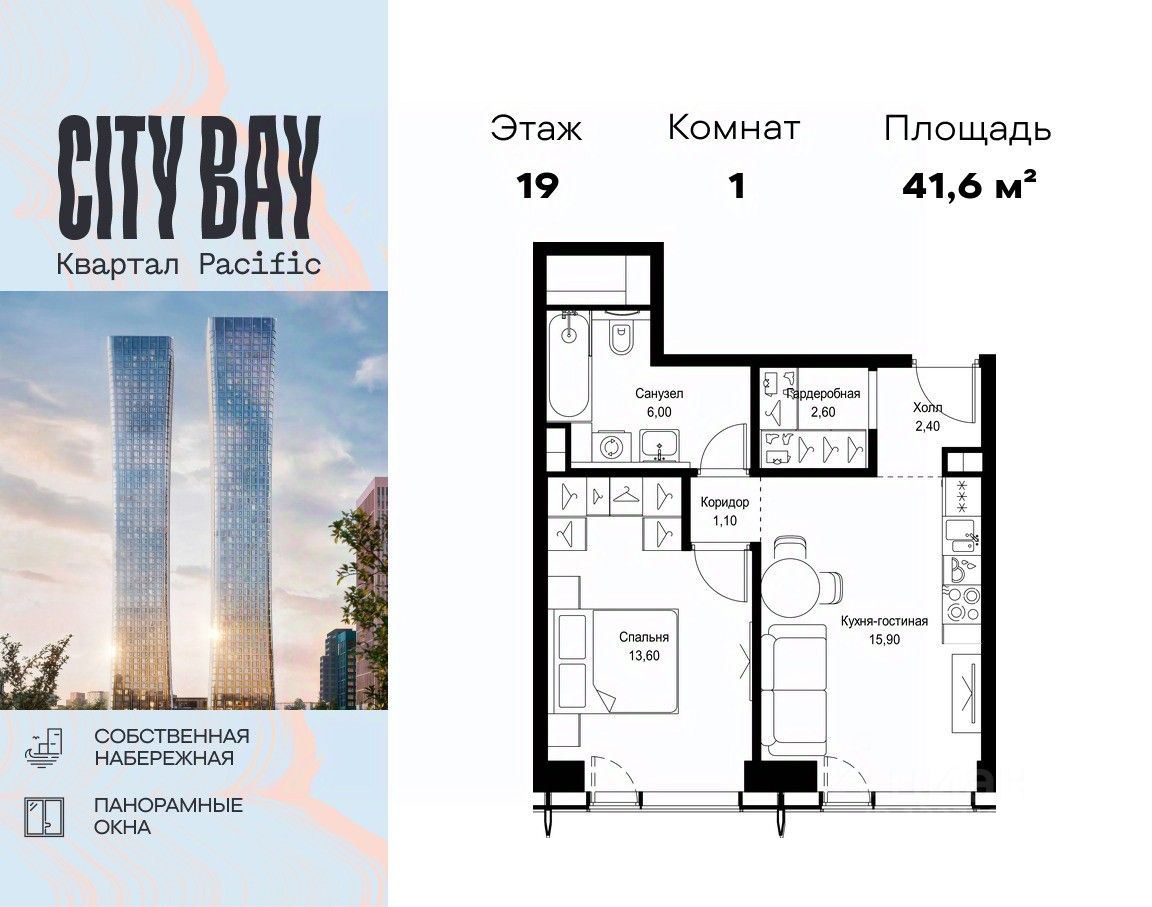 Продаётся 1-комнатная квартира общей площадью 41.60 м² без отделки в ЖК City Вау, квартале Pacific, на 19-м этаже 21 этажного дома.