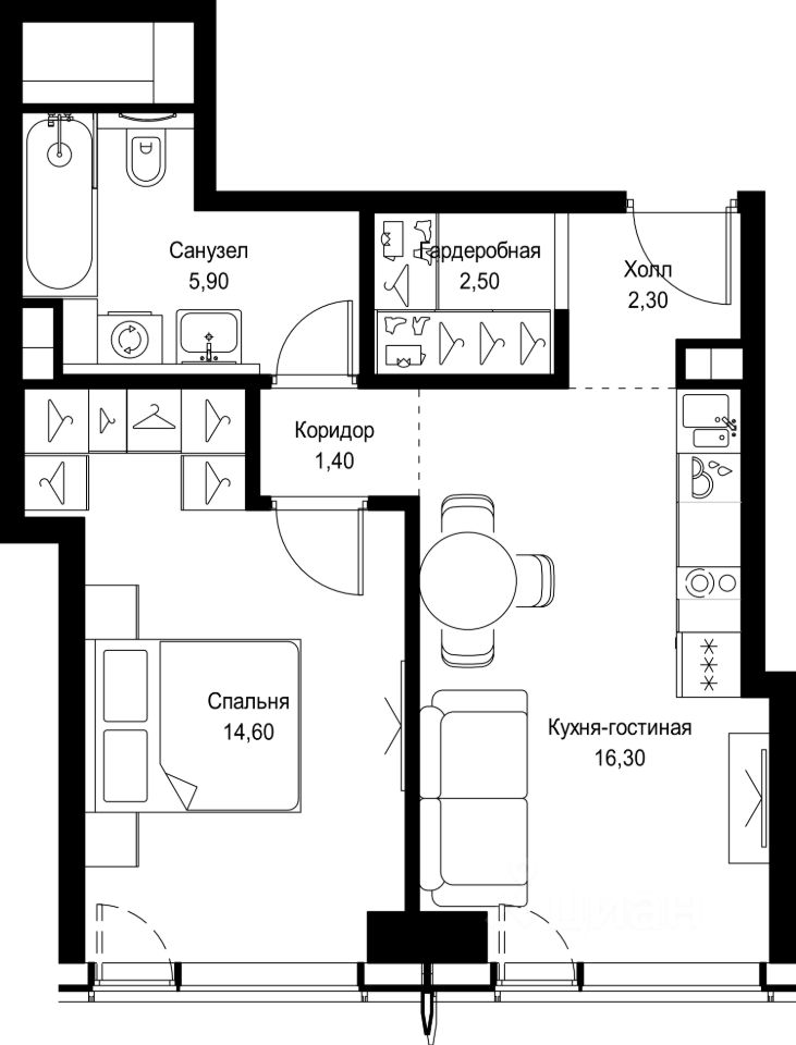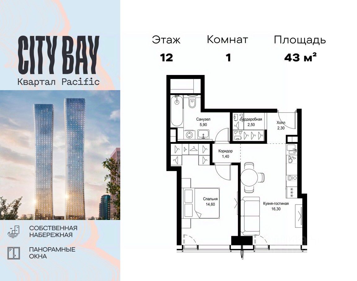 Продаётся 1-комнатная квартира общей площадью 43 м² без отделки в ЖК City Вау, квартале Pacific, на 12-м этаже 14 этажного дома.