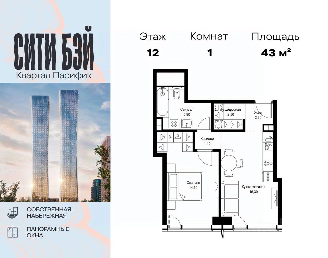 Продаётся 1-комнатная квартира общей площадью 43 м² без отделки в ЖК Сити Бэй, квартале Пасифик, на 12-м этаже 59 этажного дома.