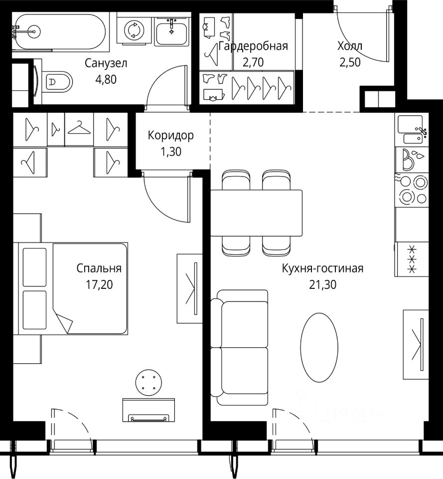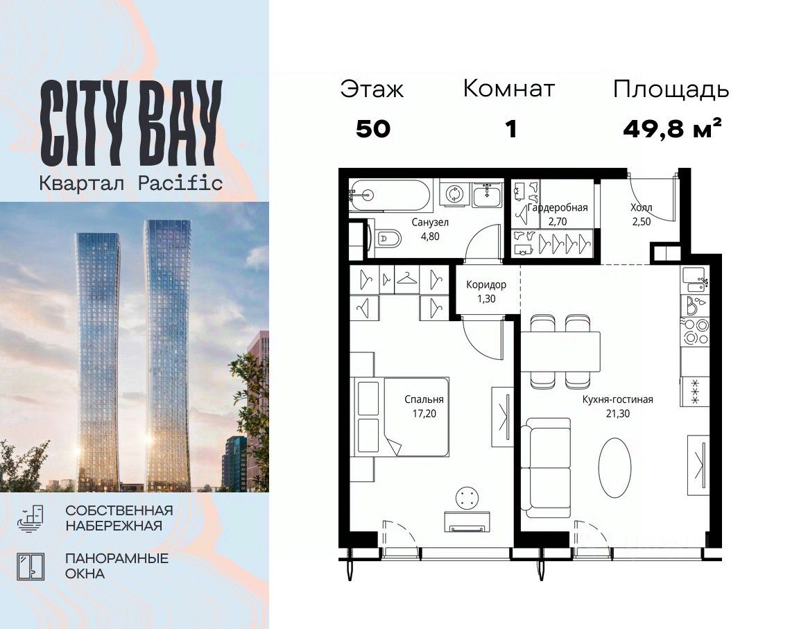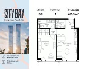 Продаётся 1-комнатная квартира общей площадью 49.80 м² без отделки в ЖК City Вау, квартале Pacific, на 50-м этаже 59 этажного дома.