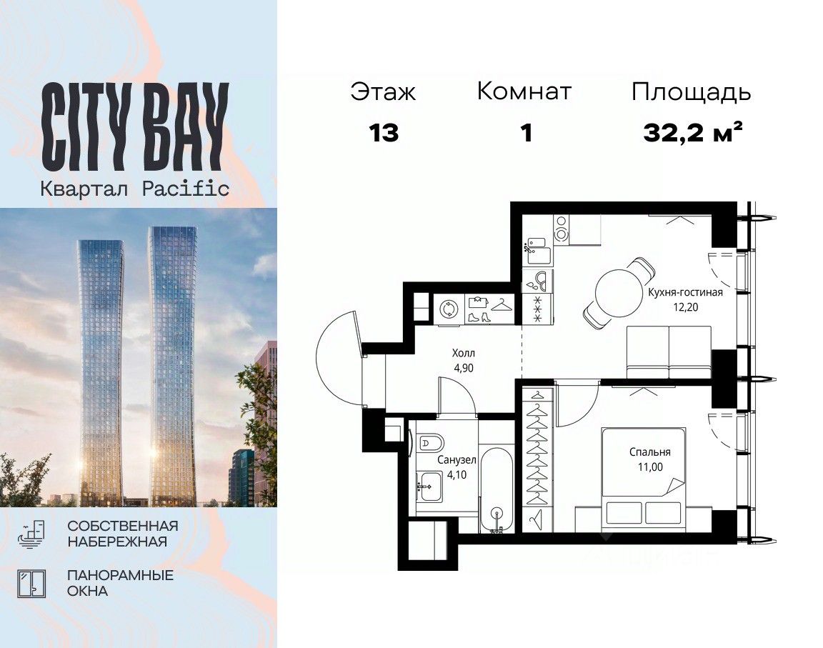 Продаётся 1-комнатная квартира общей площадью 32.20 м² без отделки в ЖК City Вау, квартале Pacific, на 13-м этаже 59 этажного дома.