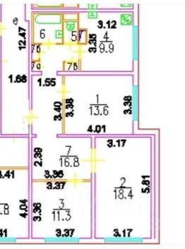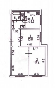 Площадь комнат: 13,6; 18,4; 18,8 кв.м