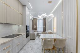 Просторная кухня-гостиная — идеальное место для встреч с близкими или тихих вечеров в одиночестве. Тёплые оттенки отделки, эксклюзивная мебель и изысканные элементы декора создают атмосферу настоящего дома — утончённого, но не вычурного.
