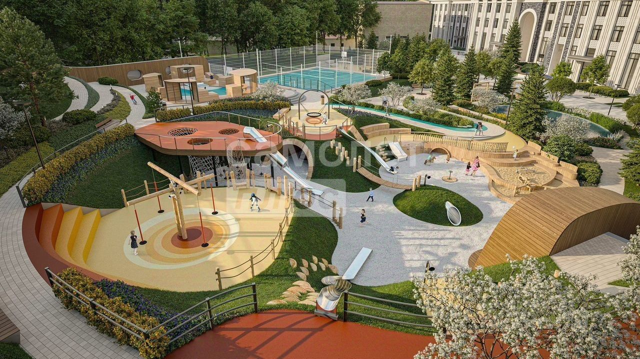 Благоустроенная территория: Ландшафтный двор площадью 1,7 га с зонами отдыха и активностей.