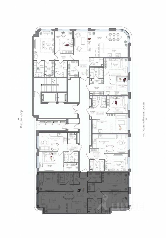 Внутренний двор 1,5 га функциональное и безопасное пространство для игр, работы и занятий спортом. Пешеходный променад для прогулок. Дома переменной этажности. Есть подземный паркинг.