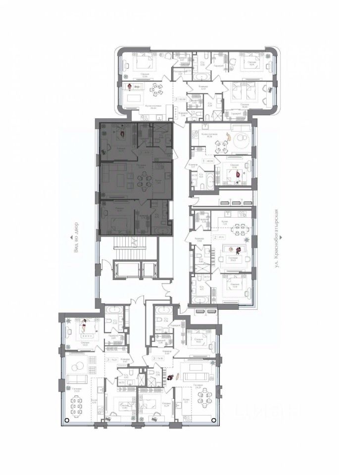 Внутренний двор 1,5 га функциональное и безопасное пространство для игр, работы и занятий спортом. Пешеходный променад для прогулок. Дома переменной этажности. Есть подземный паркинг.