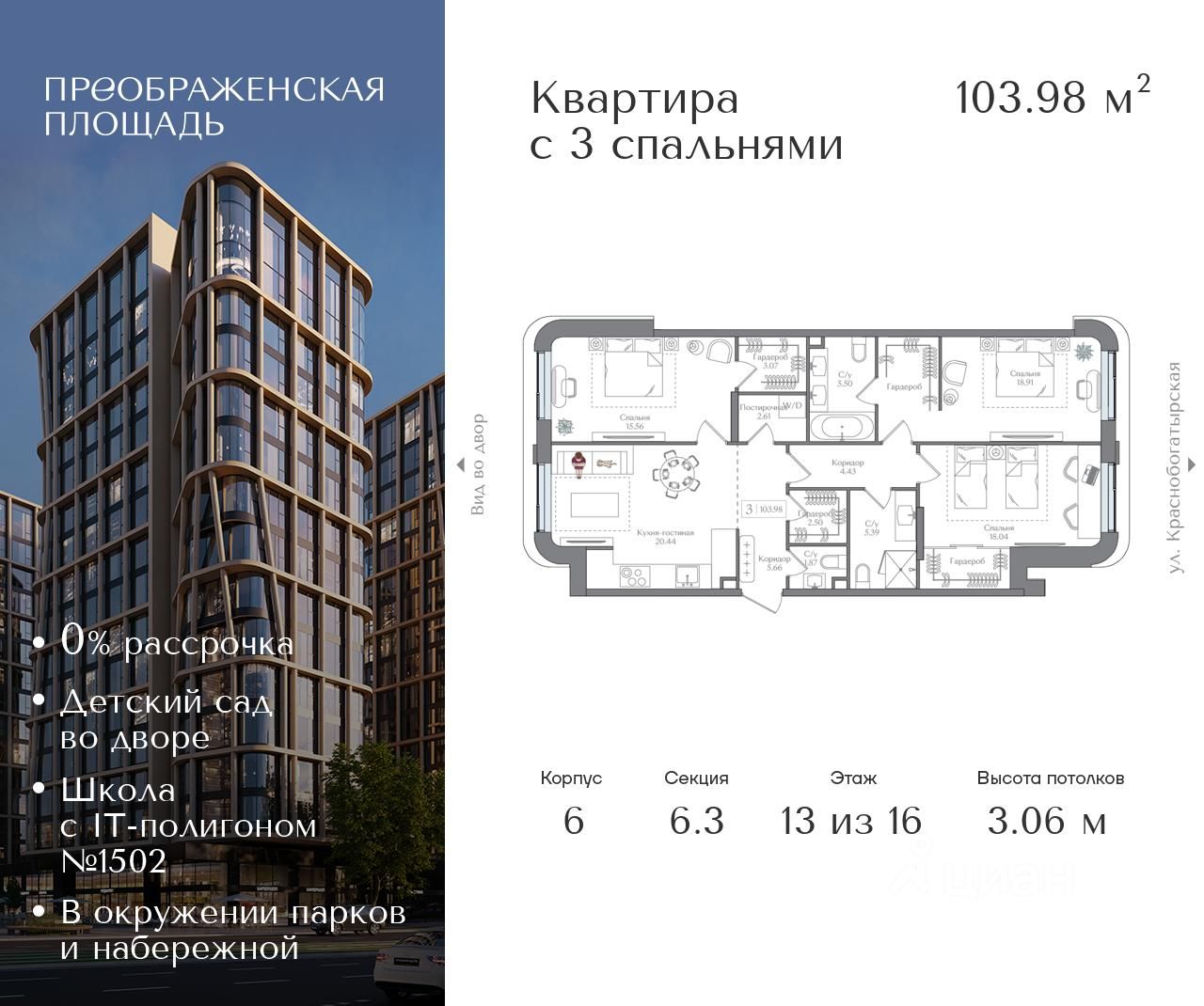 Квартира на 13 этаже в жилом комплексе премиум-класса "Преображенская площадь". Общая площадь: 103.98 кв.м.