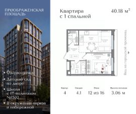 Квартира на 12 этаже в жилом комплексе премиум-класса "Преображенская площадь". Общая площадь: 40.18 кв.м.