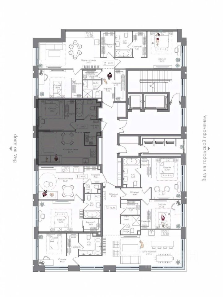 Внутренний двор 1,5 га функциональное и безопасное пространство для игр, работы и занятий спортом. Пешеходный променад для прогулок. Дома переменной этажности. Есть подземный паркинг.