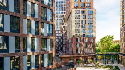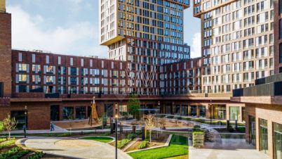 Главное о доме. Vander Park — квартал на Рублёвском шоссе с двором-парком без машин. Архитектуру придумало голландское бюро de Architekten Cie: ступенчатые башни на общем стилобате, клинкерный кирпич в градиенте оттенков и крупные прямоугольные окна. Ландшафт спроектировала студия West 8: прогулочные маршруты, террасы, сезонные посадки и игровые скульптуры. В лобби — натуральный камень, мягкий свет, стойка ресепшн и места для колясок и велосипедов. Внутри комплекса работают фитнес-клуб VanderFit с бассейном и детский сад Kosmo Kids. На первых этажах — повседневные сервисы и кафе, а по соседству в Kuntsevo Plaza — World Class и кинотеатр. Многоуровневый паркинг связан с корпусами лифтами.