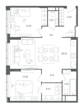 Функциональная планировка: просторная кухня-гостинная с видовыми окнами, две изолированные спальные комнаты, 2 совмещенных санузла, холл.