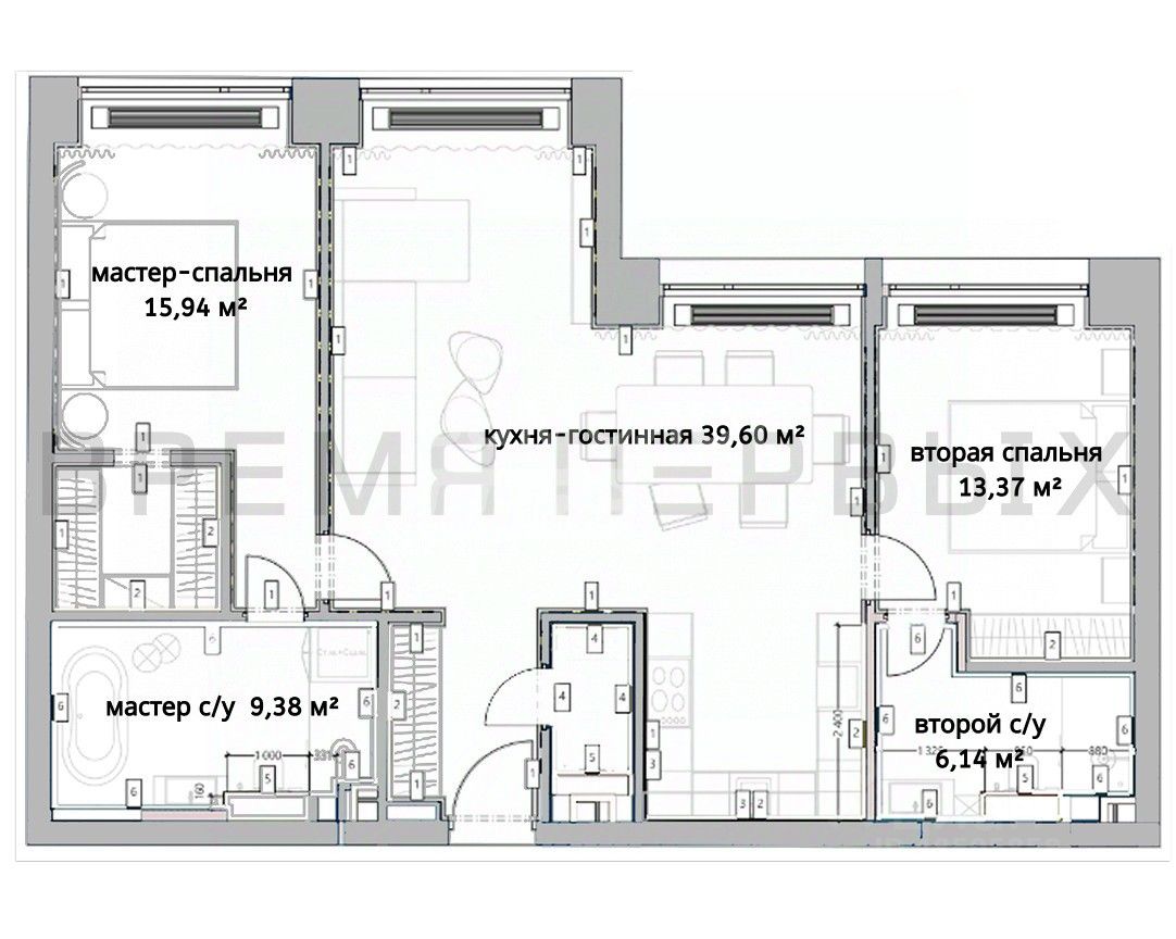 Формат: евро-3КК (2 спальни + кухня-гостиная)
