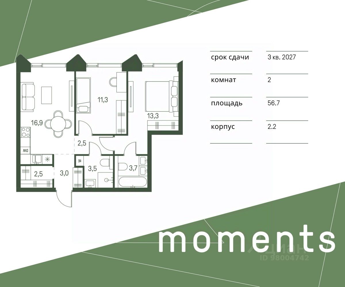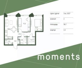 Продается 2-к. квартира номер 1132 общей площадью 56.7 кв.м. на 19-м этаже 34 этажного дома, корпус 2.2. С отделкой White Box.